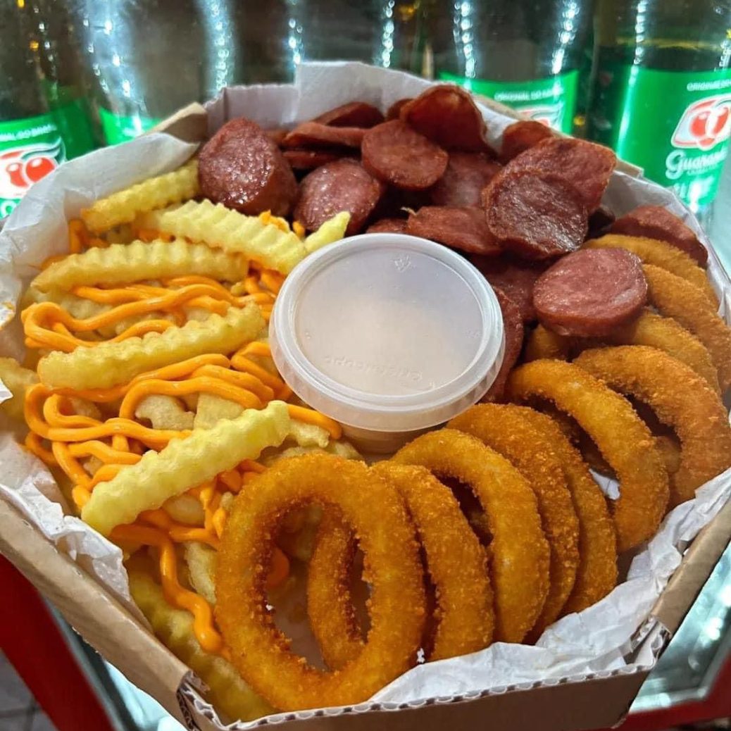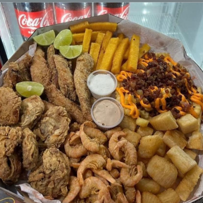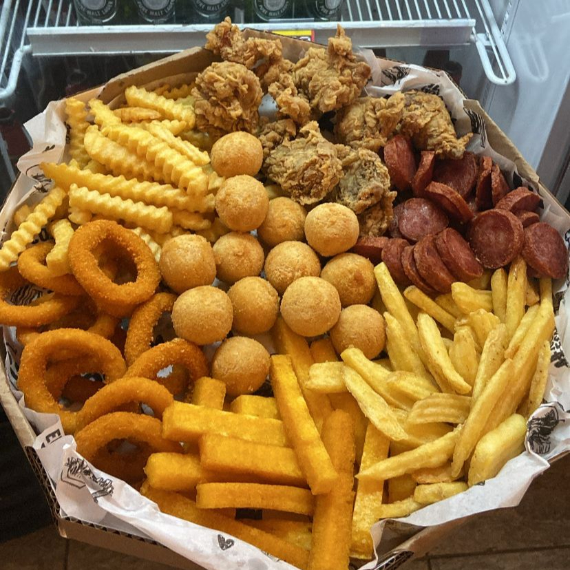 Acompanha aneis de cebola, frango, batata frita ,calabresa, bolinho de aipim com recheio de carne seca