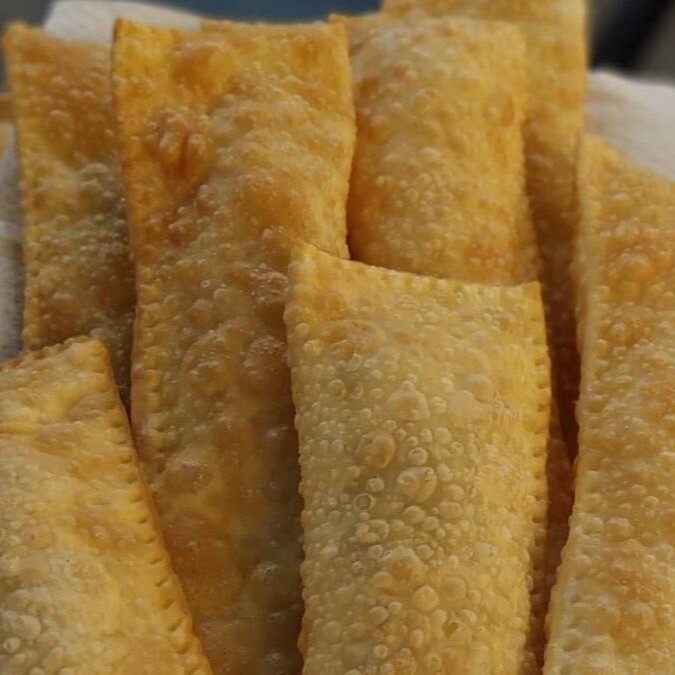 10 mini pastéis. Escolha os sabores camarão e carne seca.