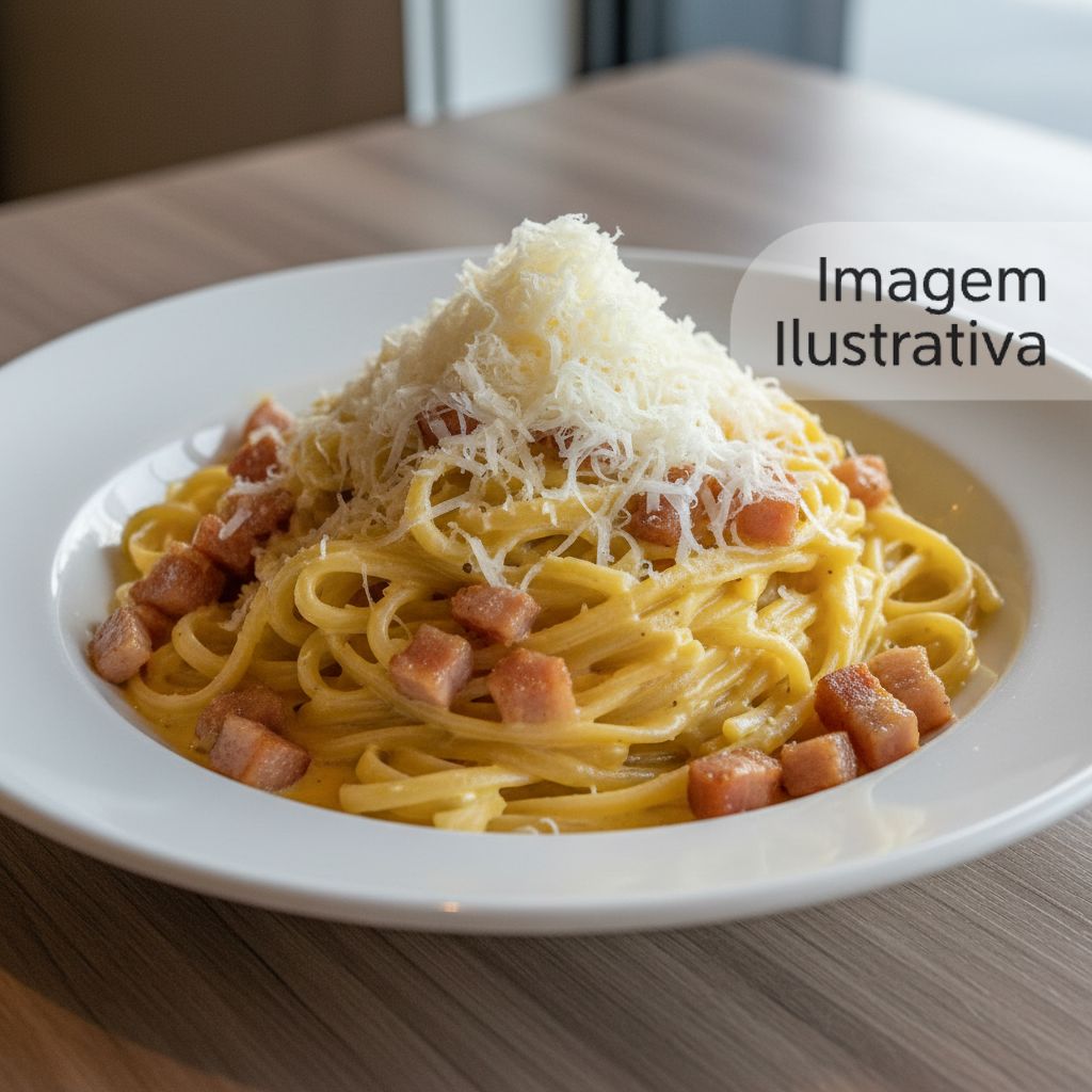 mignon grelhado (350gr) coberto com talharim ao molho 4 queijos, acompanha arroz branco e batata palha