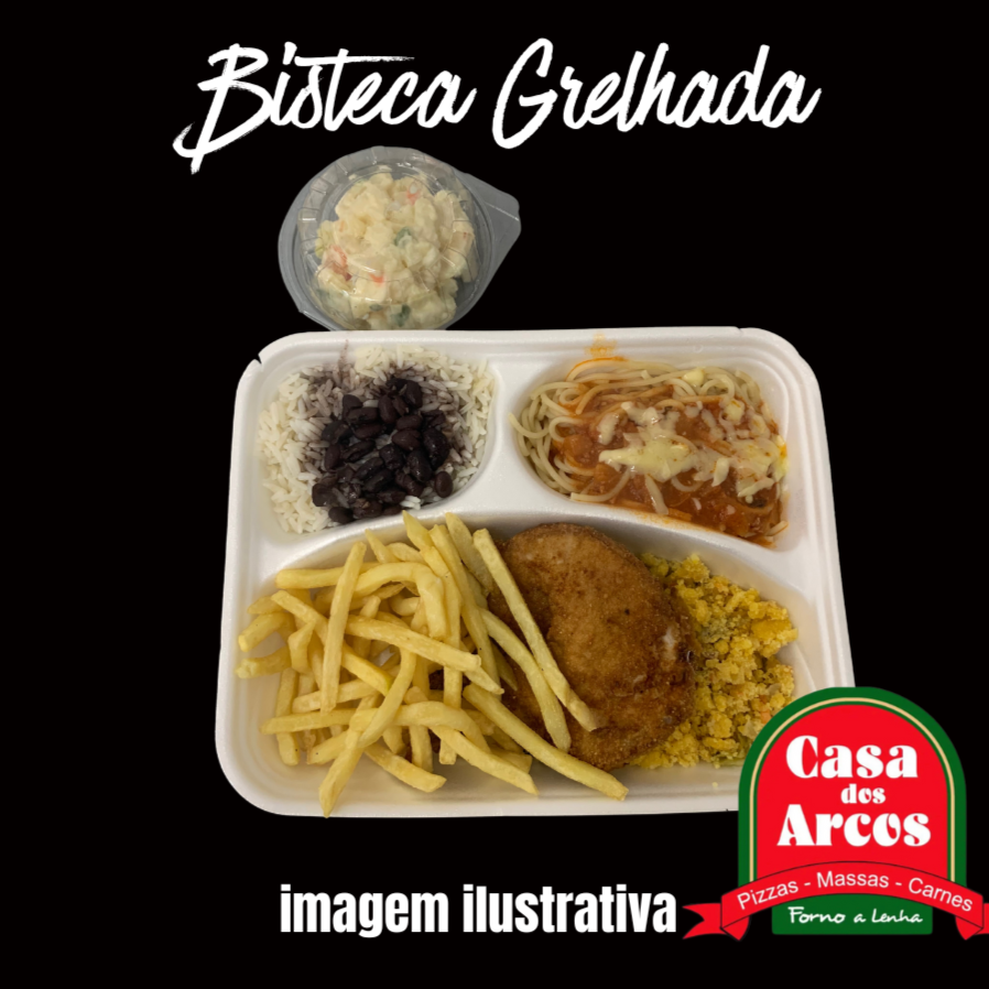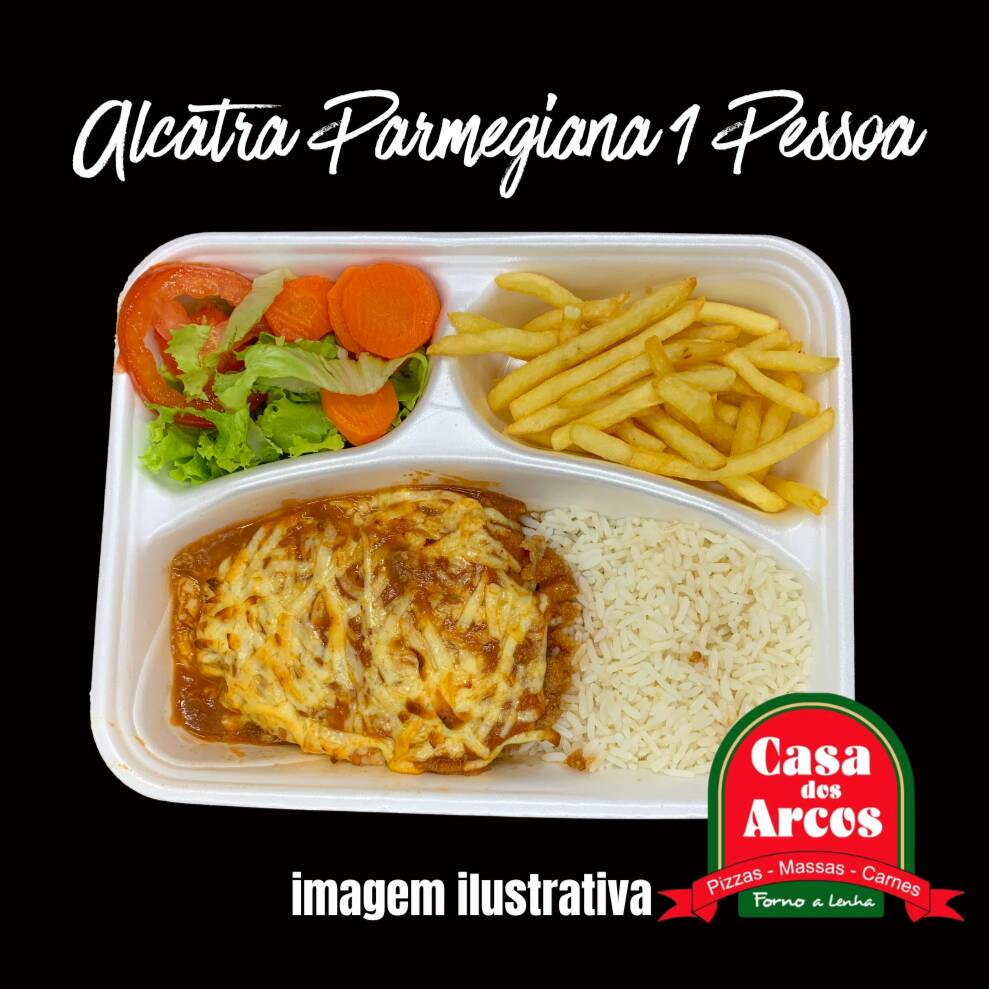 marmitex com 3 divisórias. alcatra recheado com queijo e presunto, empanado e frito, coberto com molho ao sugo da casa e queijo parmesão, gratinado. acompanha arroz branco e batata frita.