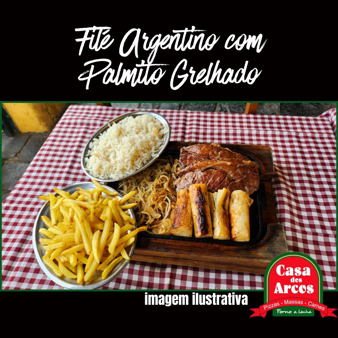 filé argentino (450gr) grelhado (ponto da casa - rosado) coberto com cebola chapeada e palmitos grelhados. acompanha arroz branco e batata frita