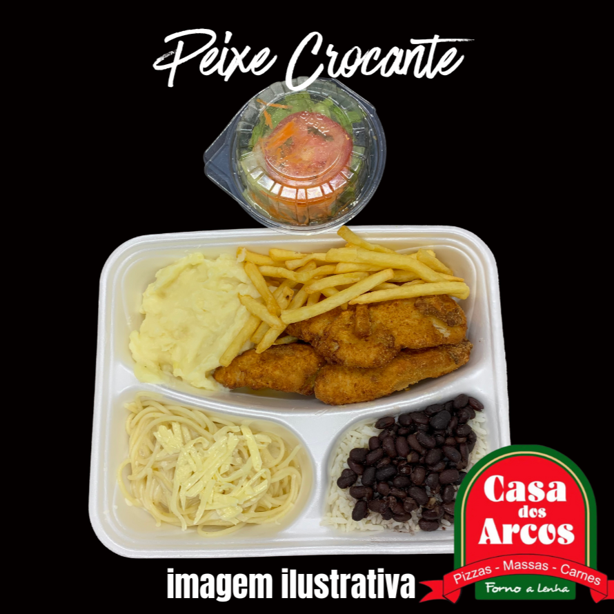 marmitex com 3 divisórias. filé de peixe crocante, spaguetti ao molho branco, purê de batata, salada, arroz e feijão do dia.