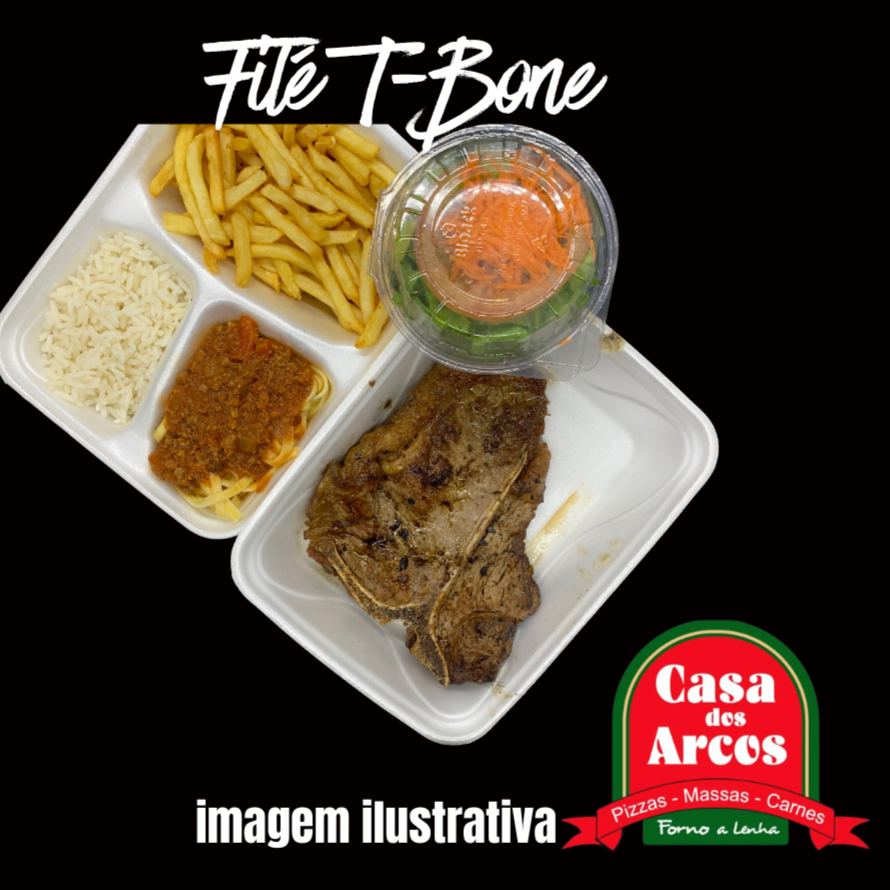 Filé t-bone grelhado, talharim a bolonhesa, arroz branco, batata frita e salada