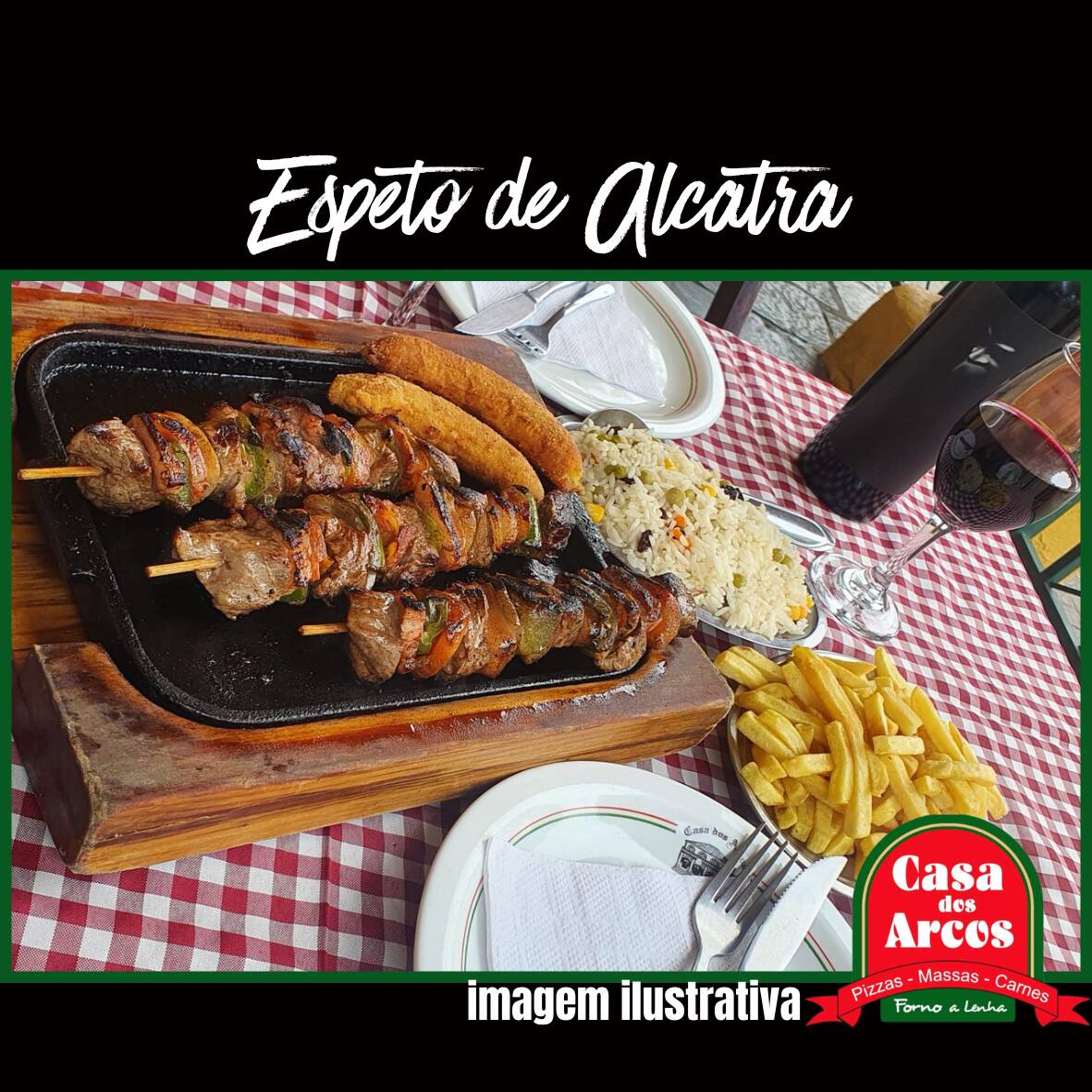 cubos de alcatra intercalados com cebola, pimentão verde e bacon no espeto (3 espetos - 400gr), acompanha arroz branco, batata frita e banana a milanesa