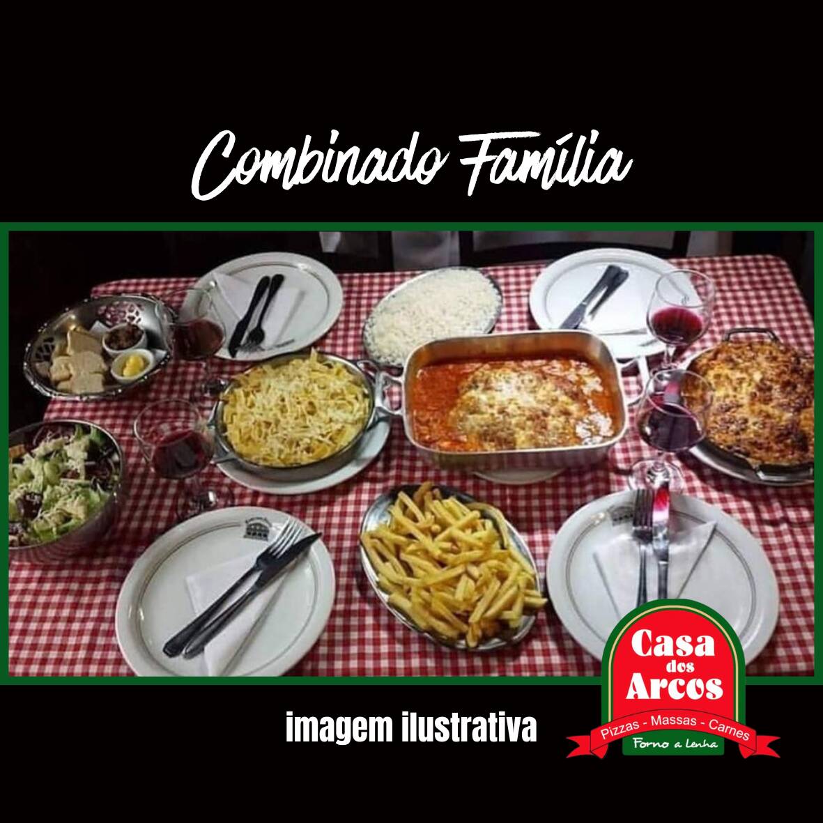 prato completo para servia a família. o prato vai com 1 alcatra a parmegiana, 1 lasanha, 1 talharim, 1 porção de arroz branco, 1 porção de batata frita e 1 porção de salada.