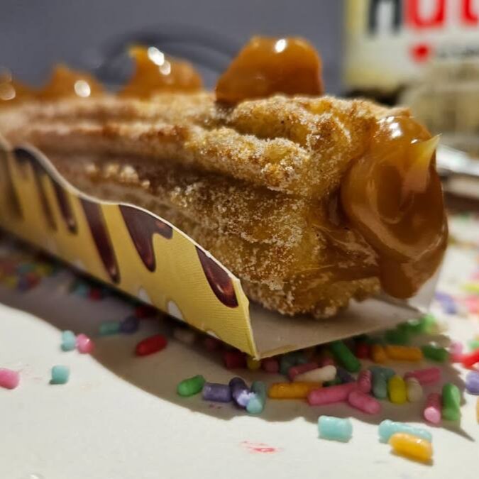 Churro com recheio meio a meio (massa crocante por fora e macia por dentro).