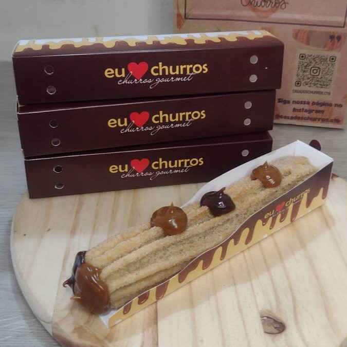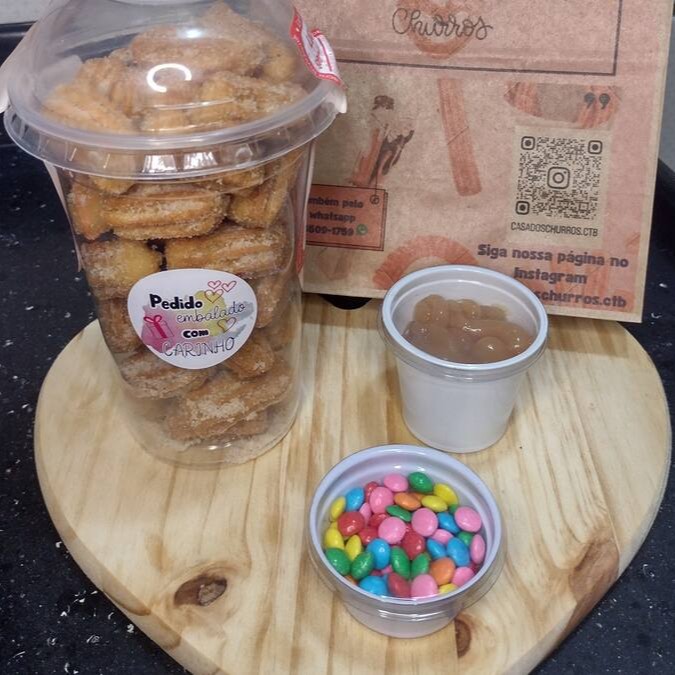 6 unidades de churros(massa fininha e crocante) acompanha 60g de recheio de sua preferência e 30g de confeito.