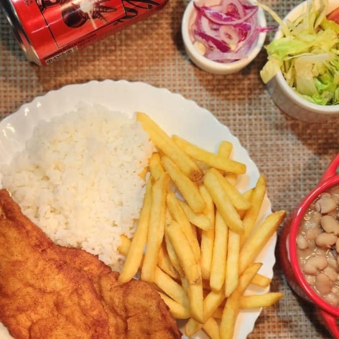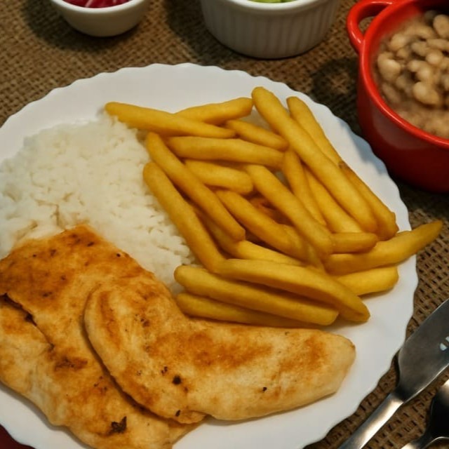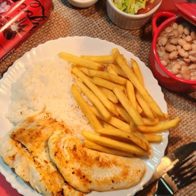 Filé de Frango temperado grelhado, arroz branco soltinho, feijão branco levemente temperado ao alho e batatas fritas sequinhas. Tudo em uma marmita de isopor com divisórias, para preservar o frescor dos ingredientes Opções: >> Escolha sua bebida da linha Coca-Cola, entre refrigerantes, sucos e água (Conforme disponibilidade) >> Com ou sem salada >> Feijão junto ou separado