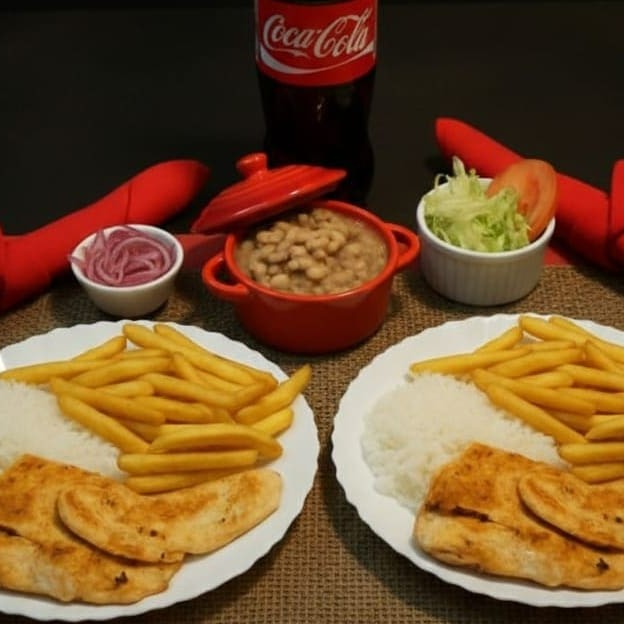 2x Marmitas de Filé grelhado de frango temperado, arroz branco soltinho, feijão branco levemente temperado ao alho e batatas fritas sequinhas. Tudo em duas marmita de isopor com divisórias, para preservar o frescor dos ingredientes Opções: >> Escolha sua bebida linha Coca-Cola (Conforme disponibilidade nas opções) >> Com ou sem salada >> Feijão junto ou separado