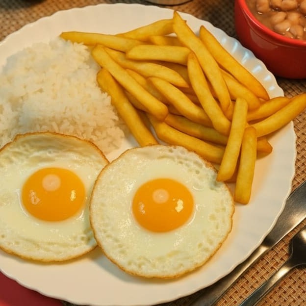 Executivo do povo repleto de sabor! Imagem Meramente Ilustrativa*** - 2x Ovos fritos - Arroz branco, - Feijão branco levemente temperado ao alho - Batatas fritas sequinhas Tudo em uma marmita de isopor com divisórias, para preservar o frescor dos ingredientes Opções: >> Com ou sem salada >> Feijão junto ou separado #frango, #almoço, #batata, #frita, #arroz, #salada, #saudável, #executivo, #marmita, #feijão, #barato, #rápido, #prato, #brasileira
