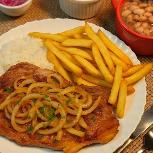 Suculento bife acebolado com um toque de cheiro verde, arroz branco soltinho, feijão branco levemente temperado ao alho e batatas fritas sequinhas. Tudo em uma marmita de isopor com divisórias, para preservar o frescor dos ingredientes Opções: >> Escolha sua bebida da linha Coca-Cola, entre refrigerantes, sucos e água (Conforme disponibilidade) >> Com ou sem salada >> Feijão junto ou separado