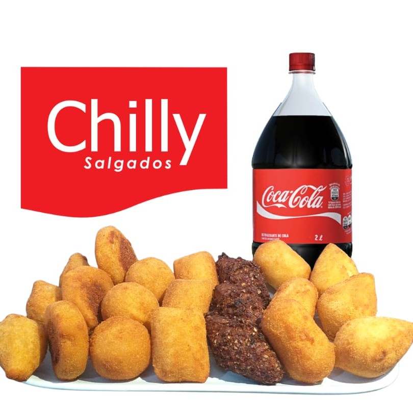 Escolha ate 2 sabores dos mini salgadinhos chilly + 1 coca 2 L gelada.