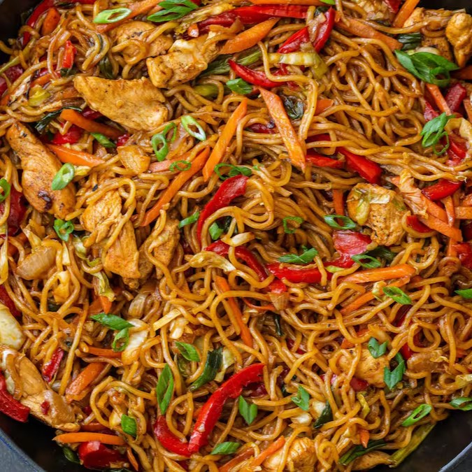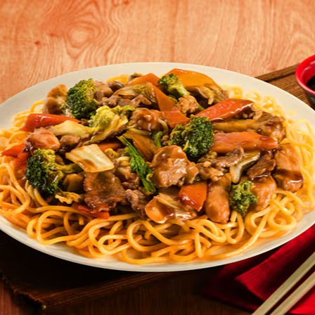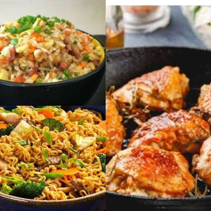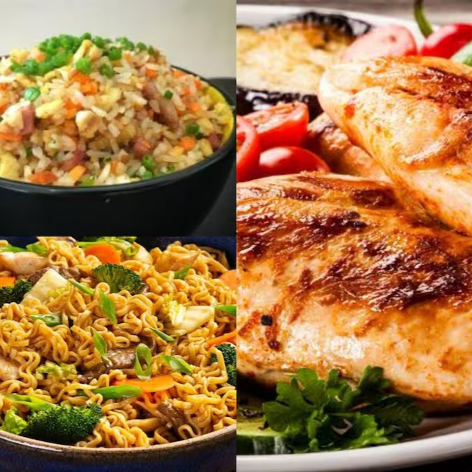 Arroz yakimeshi, yakisoba de legumes, frango grelhado