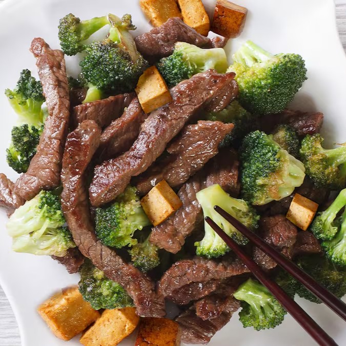 Uma porção de carne alcatra com mix de brócolis refogado.