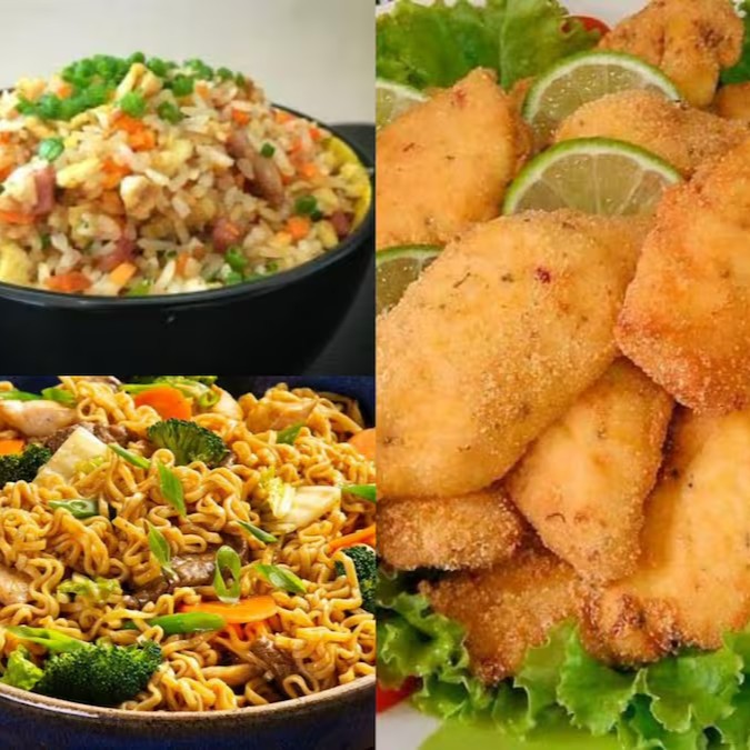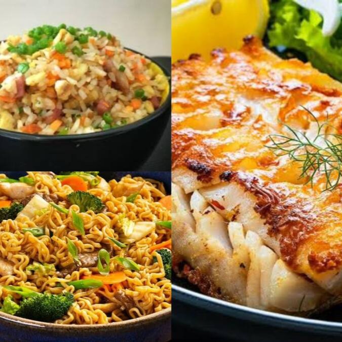 Arroz yakimeshi, yakisoba de legumes, peixe frito