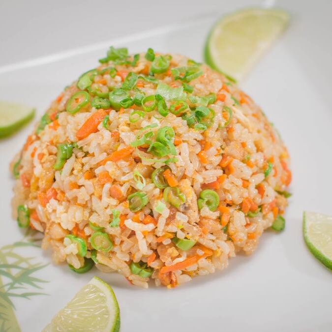 Marmita premium de arroz yakimeshi com presunto, ervilha, cebola, cenoura, cebolinha, acompanha com frango grelhado, salada e croquete.