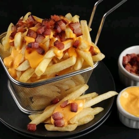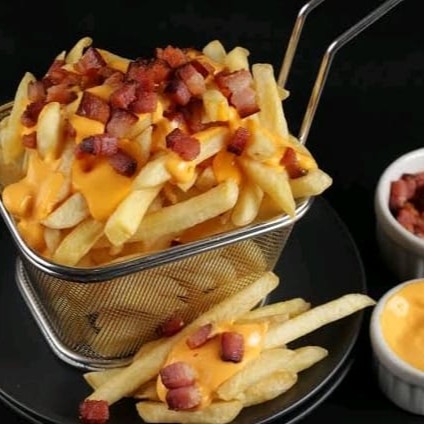 Porção generosa de batata palito crocante (350g), coberta com cheddar cremoso e bacon frito bem crocante.