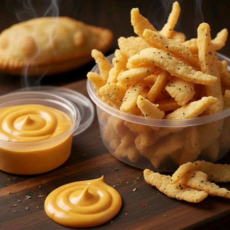Aquele snack impossível de comer um só! Cortes de massa de pastel fritos na hora até atingirem a crocância perfeita: douradinhos, sequinhos e muito leves. Acompanha um pote de molho Cheddar cremoso. É o petisco perfeito para qualquer hora do Dia!