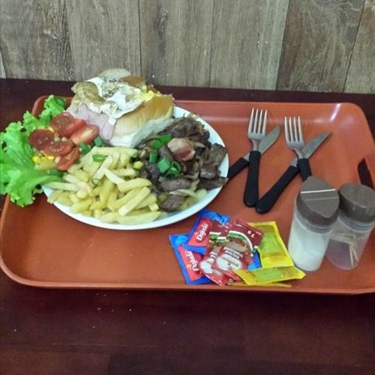 Pão, maionese, hambúrguer, tomate, alface, alcatra na chapa, bacon, calabresa, ovo, queijo, presunto, milho, e batata frita.