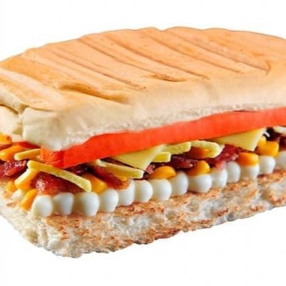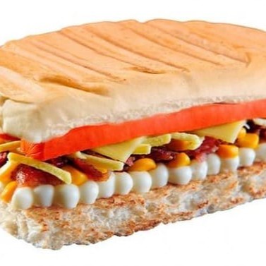 Pão, maionese, vina, queijo, presunto, orégano, tomate, milho, e batata palha.