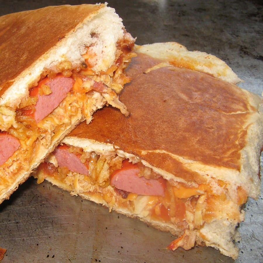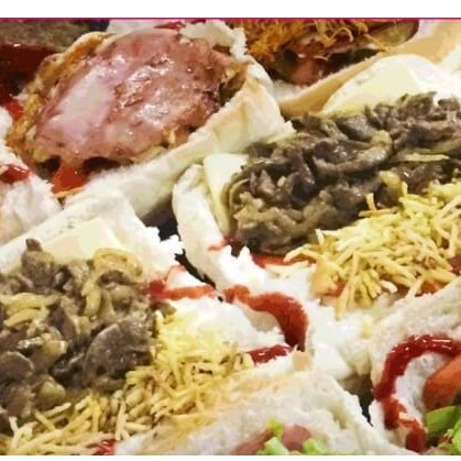 Pão, maionese, hambúrguer, tomate, alface, frango na chapa, bacon, calabresa, ovo, queijo, presunto, milho, e batata frita