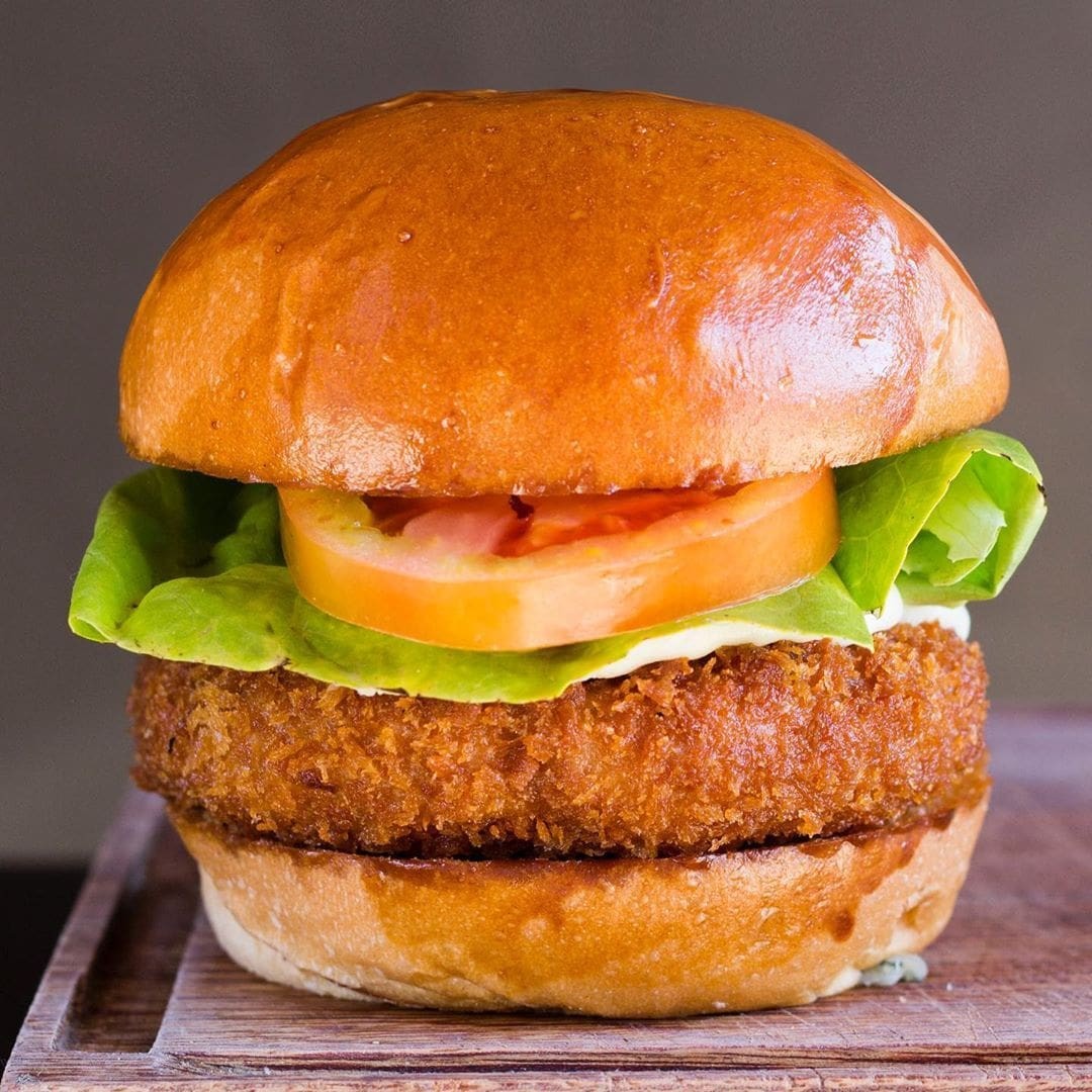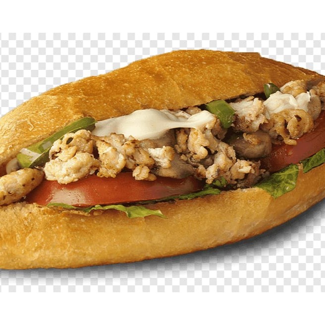 Filé de peito de frango empanado, queijo mussarela, alface americana, cebola roxa, pepino agridoce, tomate e maionese caseira