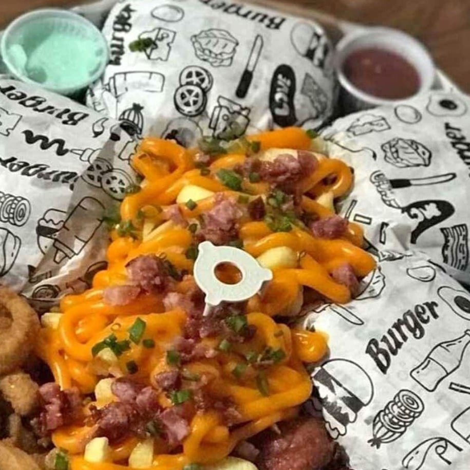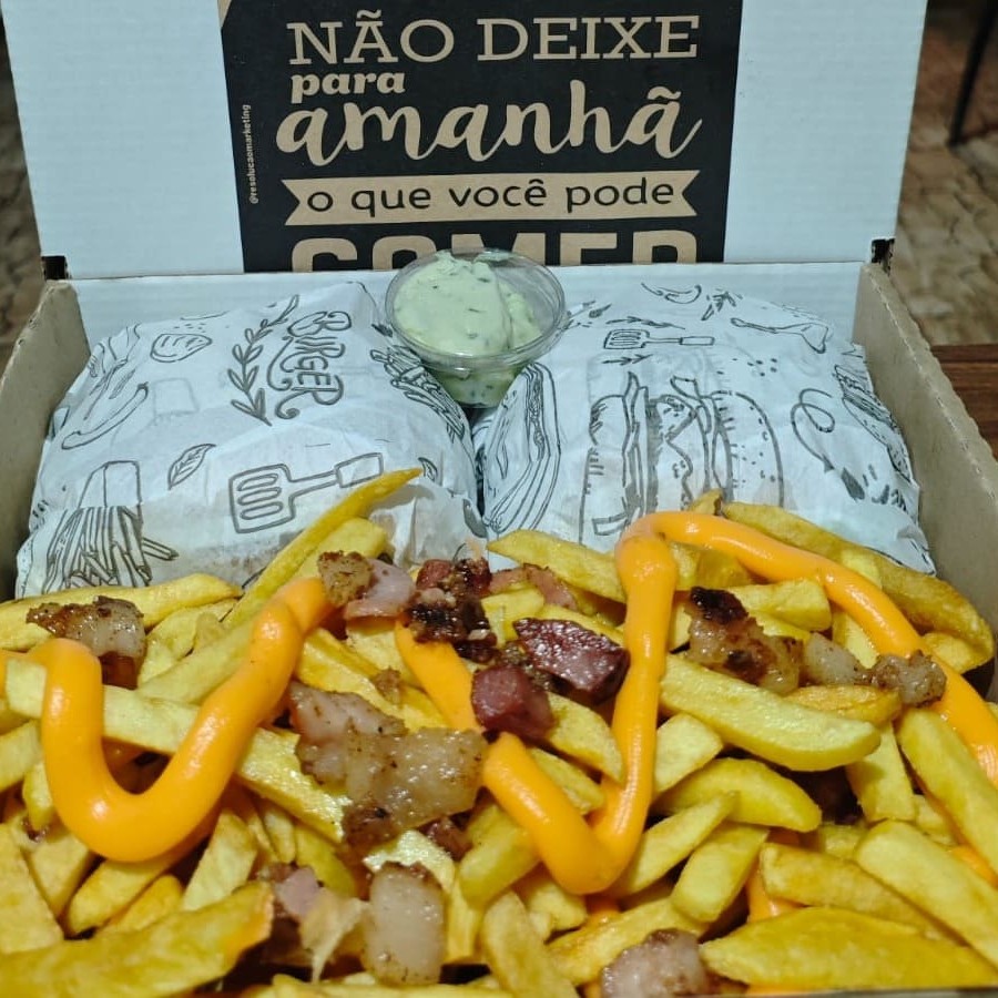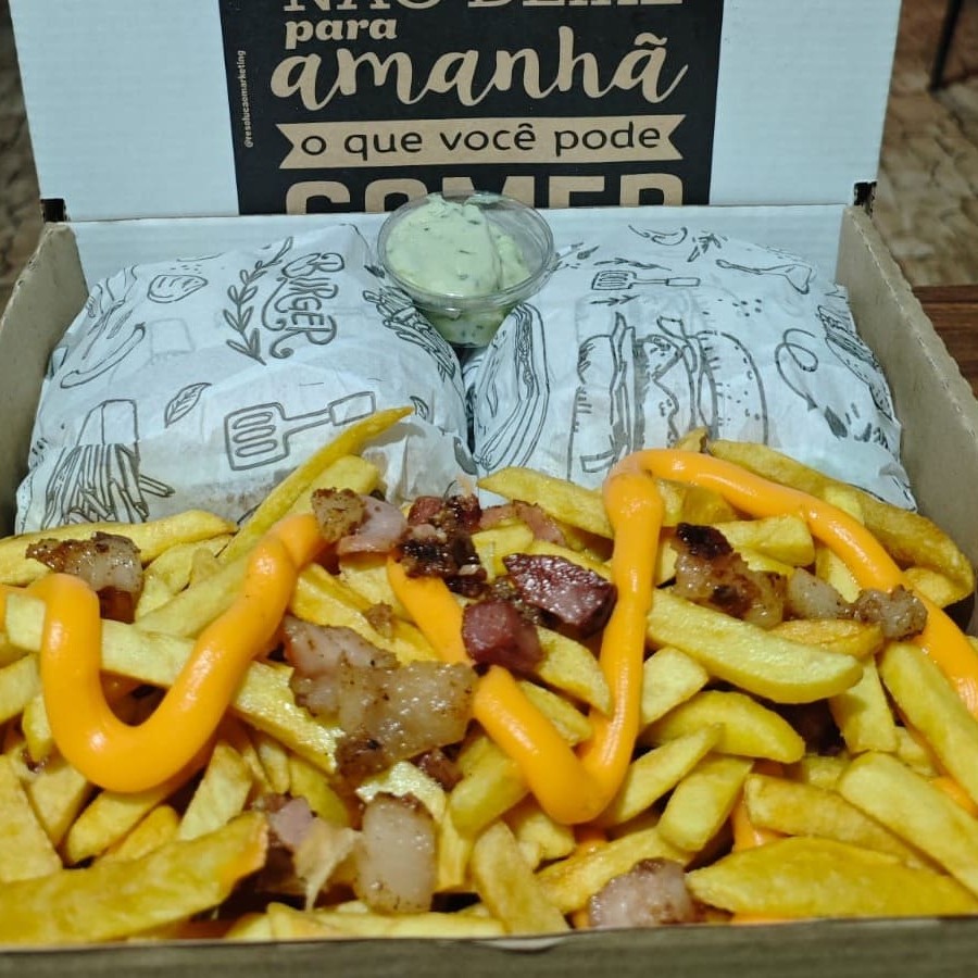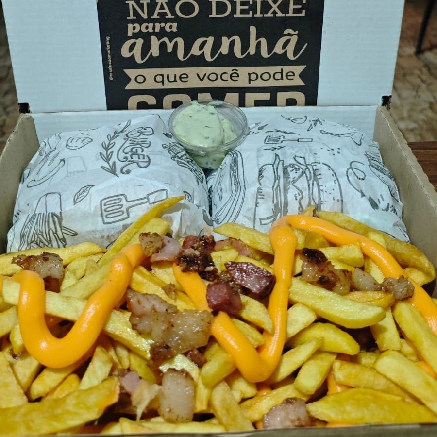 2 Deliciosos X Tudo Mais Uma Porção De Batata Crinkle Com Chedar E Bacon E 1 Potinho De Maionese De Alho