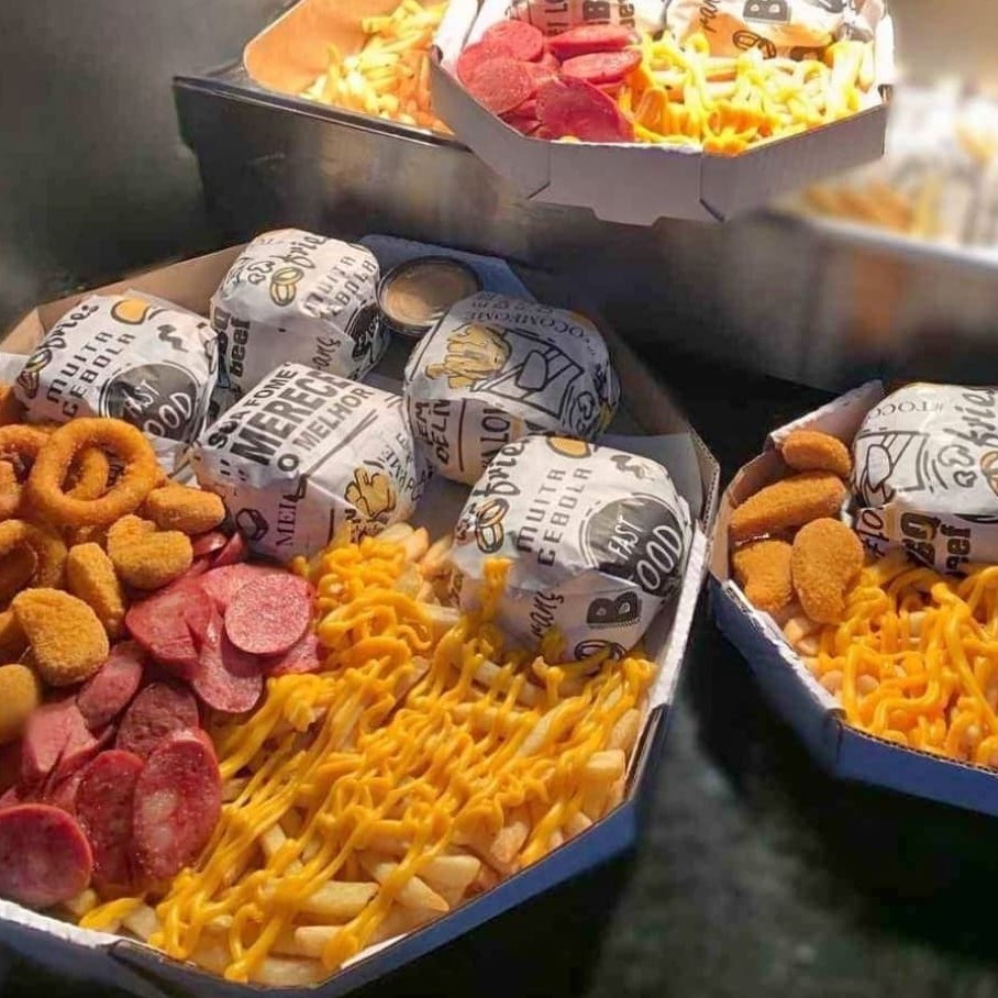 2 X Coração 2 X Alcatra Fritas Com Cheddar E Bacon Aneis De Cebola E Iscas De Frango A Milanesa