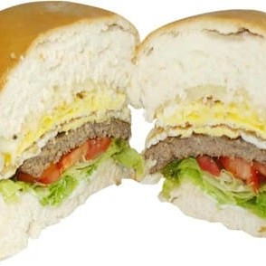 Pão, maionese, queijo, presunto, hambúrguer, alface, tomate, ovo, milho.