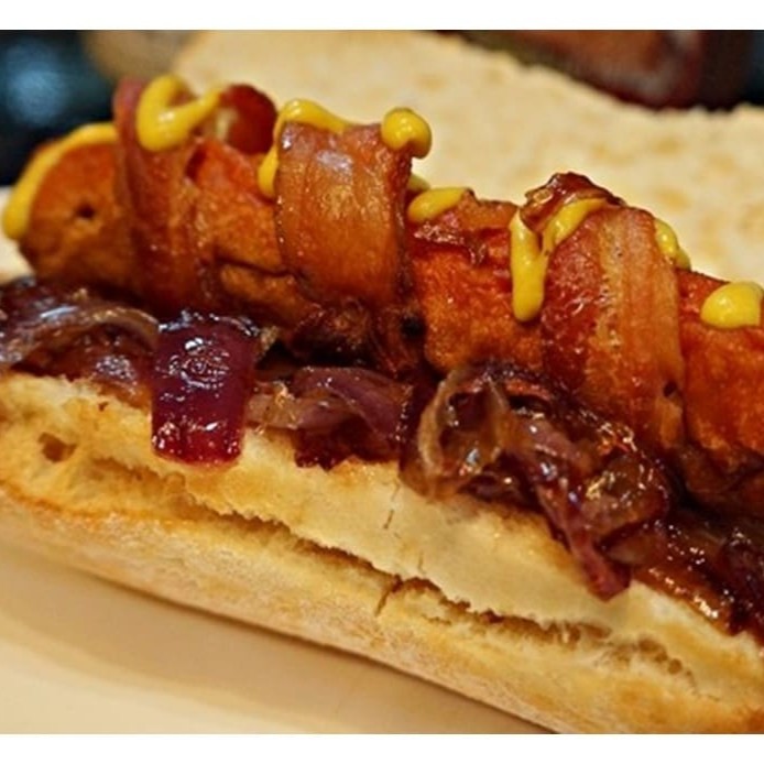 Pão, maionese, vina, bacon, tomate, milho, e batata palha.