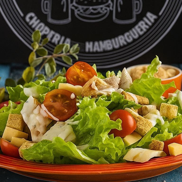 Mix De Saladas Verdes, Tomate Cereja, Pepino Agridoçe, Raspas De Queijo Parmesão, Frango Grelhado Na Chapa E Mini Torradinhas, Acompanha Molho Especial.