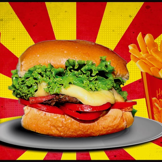Pão, maionese, queijo, presunto, hambúrguer, alface, tomate, frango, milho.