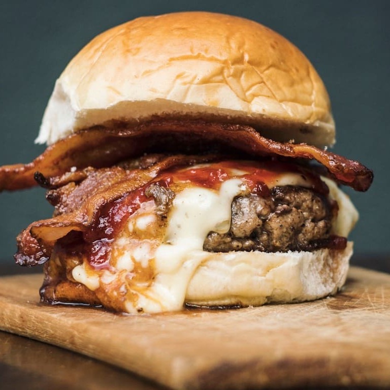 Pão, hamburguer de carne 150 gramas, queijo mussarela, tiras de bacon e maionese caseira.