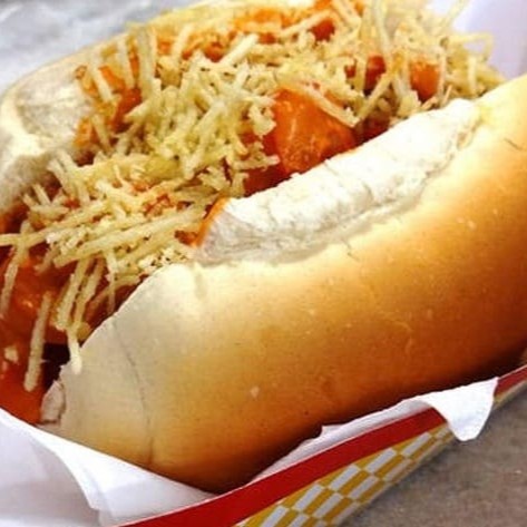 Pão, maionese, vina, calabresa, tomate, milho, e batata palha.