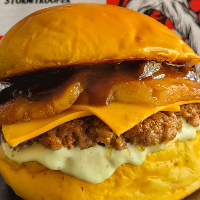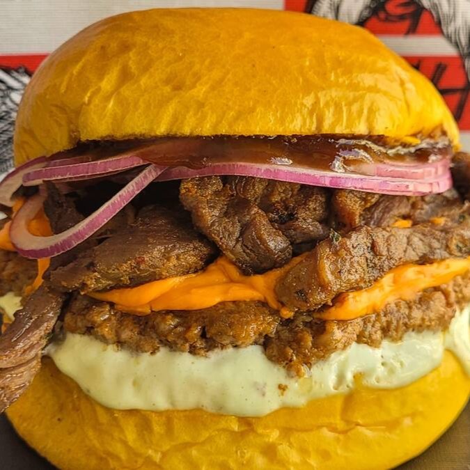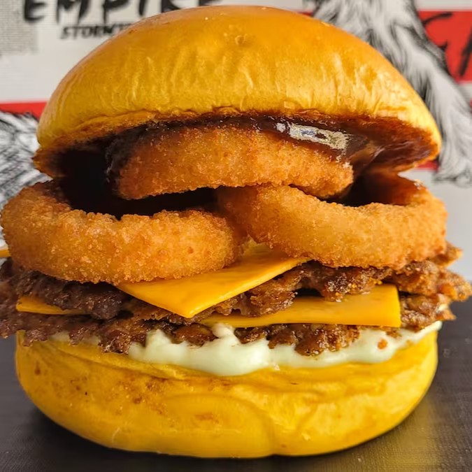 Delicie-se com pão brioche macio, recheado com 2 hambúrgueres artesanais de 40g cada, 2 fatias de queijo cheddar derretido, maionese cremosa e um toque de molho barbecue e Para completar 3 anéis de cebola empanados super saborosos. Uma explosão de sabor em cada mordida!
