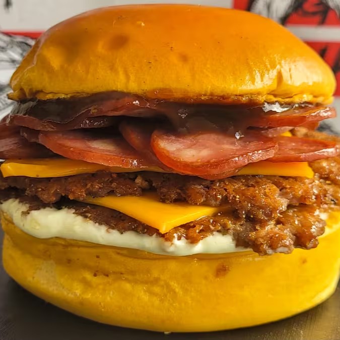Um verdadeiro deleite com pão brioche macio, recheado com 2 hambúrgueres artesanais de 40g cada, calabresa fatiada suculenta, queijo cheddar derretido, maionese cremosa e um toque de molho barbecue. Uma explosão de sabores em cada mordida!