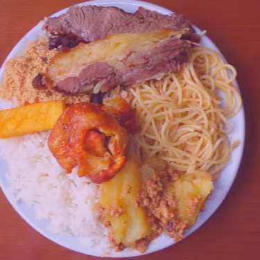 Arroz, feijão, macarrão, legume refogado (do Dia), farofa de bacon, polenta frita, 2 pedaços de carne mista(sem opção de escolha da carne)