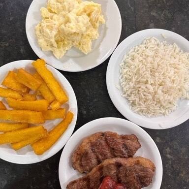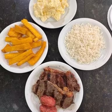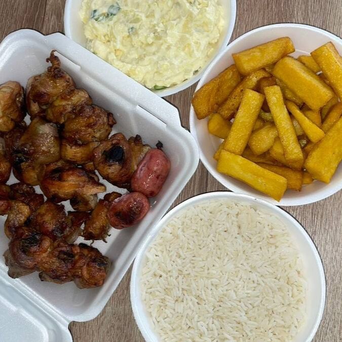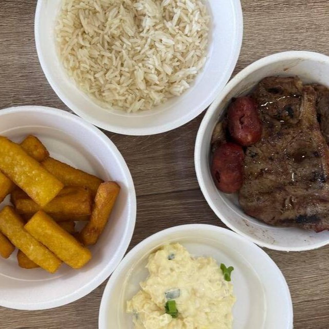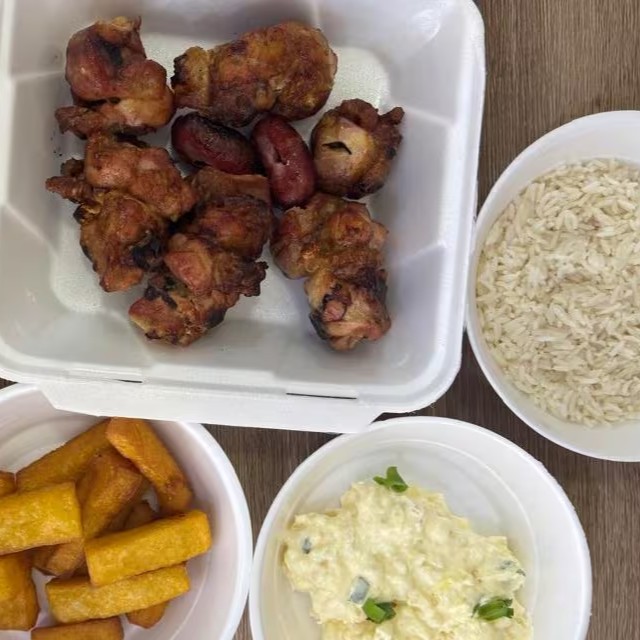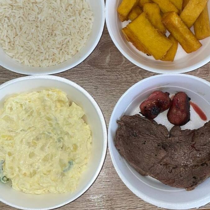 Carne, arroz branco, farofa especial, maionese, polenta frita e 2 linguiças toscana