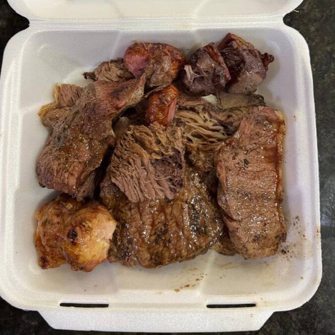 Carne, arroz, farofa especial, maionese, polenta e 2 linguiças toscana