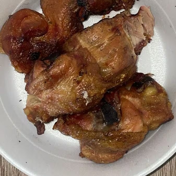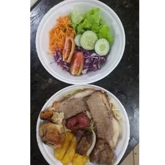 Pedaços de coxa e sobre coxas assados, farofa especial, arroz branco, maionese, polenta frita e 02 linguiça toscana assada.