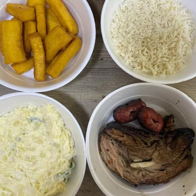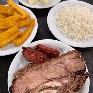Costela, arroz branco, farofa especial, maionese, polenta frita e 2 linguiças toscana