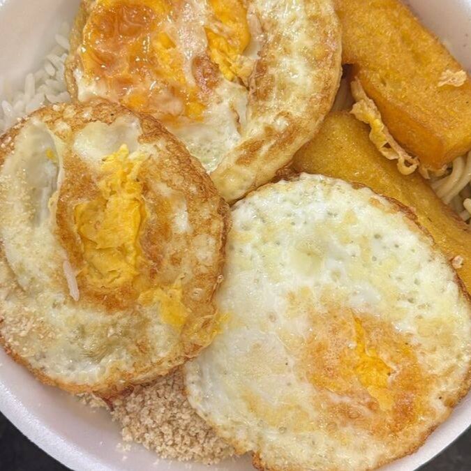 Arroz,feijao,macarrao,polenta,farofa e 3 ovos fritos