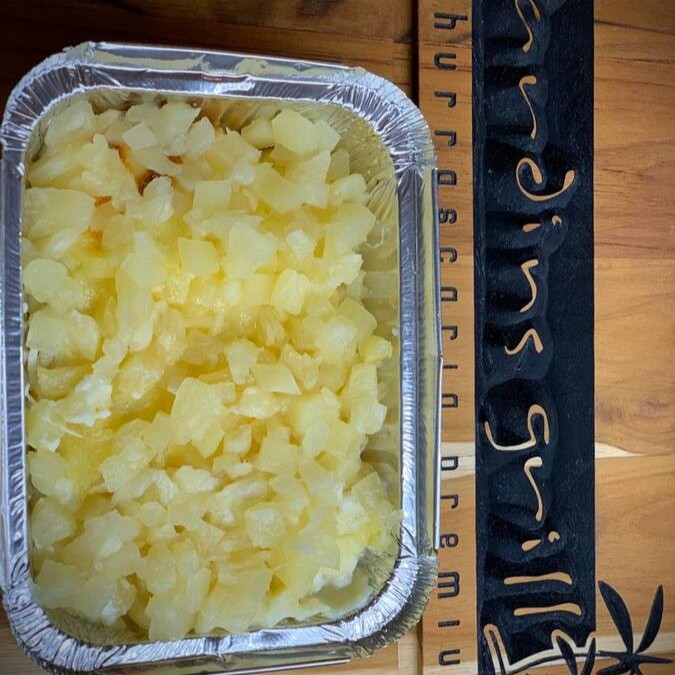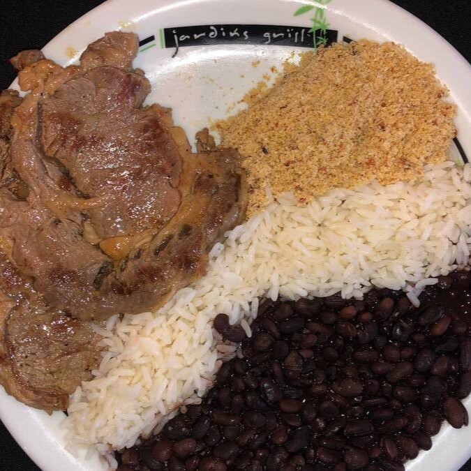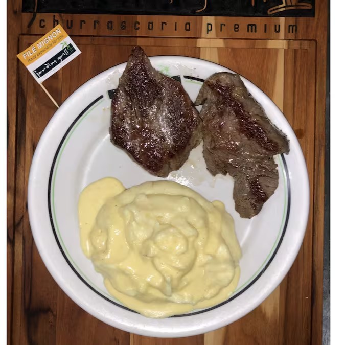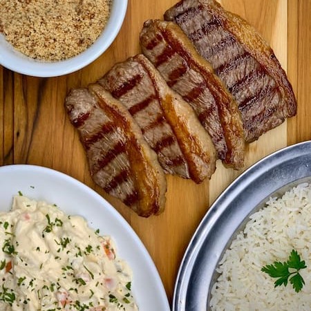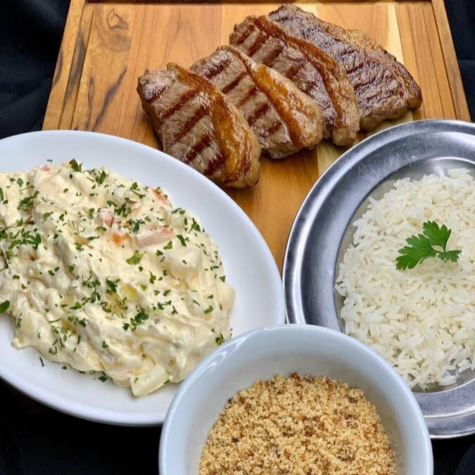 Combo com 2 fatias de picanha grill (200 gramas), maionese de batatas, farofa crocante e arroz branco. Individual
