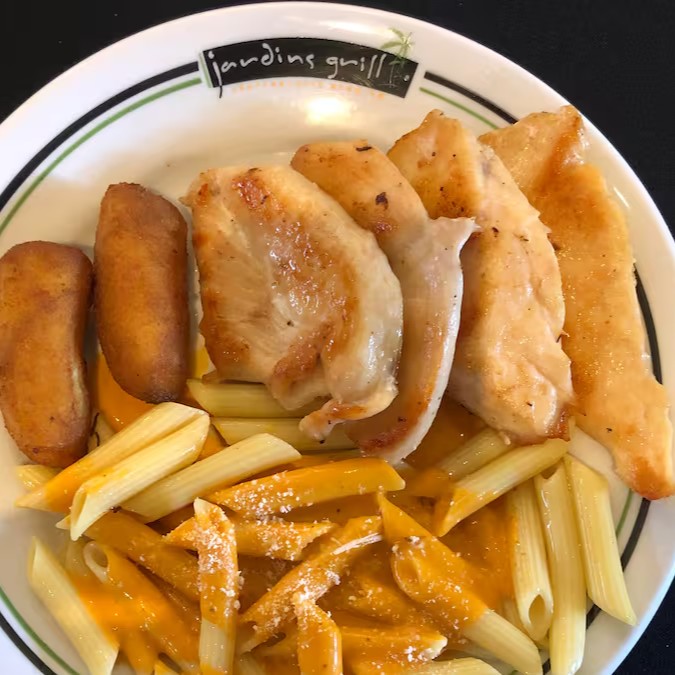 180g filet de peito de frango ,parmesão ralado, banana a milanesa , massa e molho a sua escolha