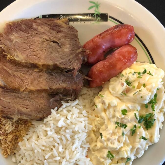 180g de cupim, 02 linguiças toscana, arroz branco, maionese de batatas e farofa