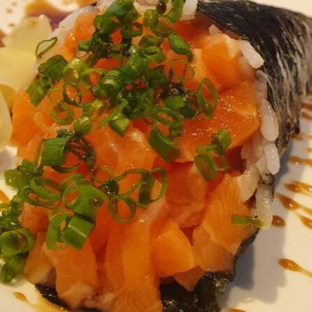Cubos de salmão , cream chease e arroz enrolados em alga marinha.