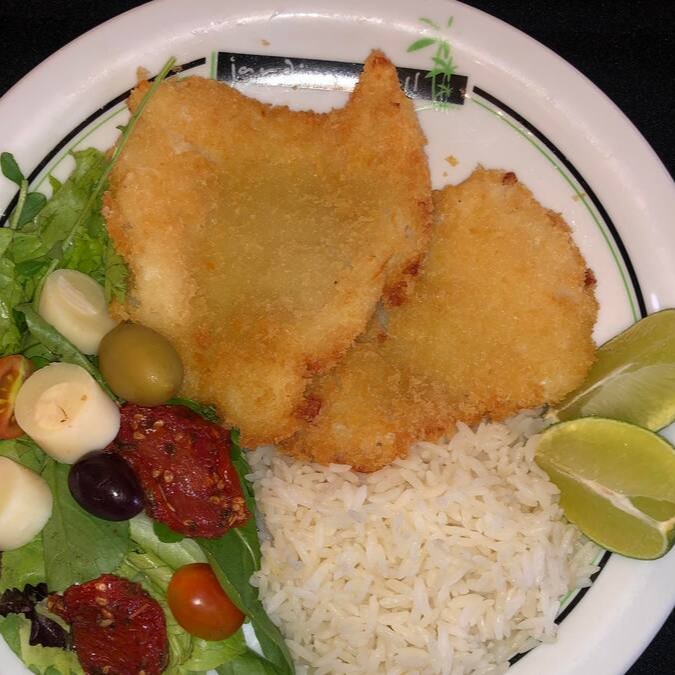180g filet de tilapia empanada crocante, arroz branco, salada mista e limão