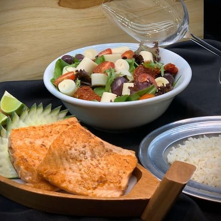 Combo com 2 fatias de salmão (200 gramas), arroz branco, salada mista (mix de folhas, palmito, tomate cereja e tomate seco) e limão fatiado. Individual