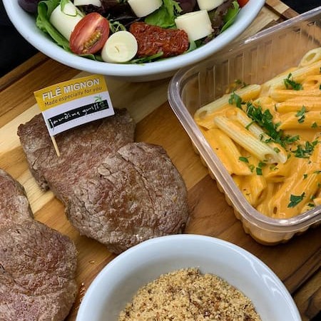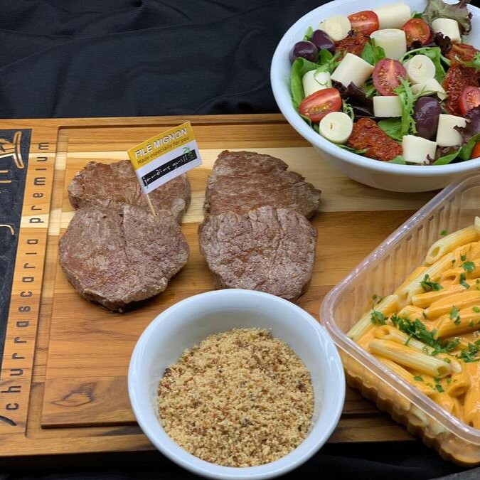 Combo com 2 fatias de escalope de mignon (200 gramas), massa, farofa crocante, salada mista (mix de folhas, palmito, tomate cereja e tomate seco. Individual