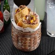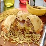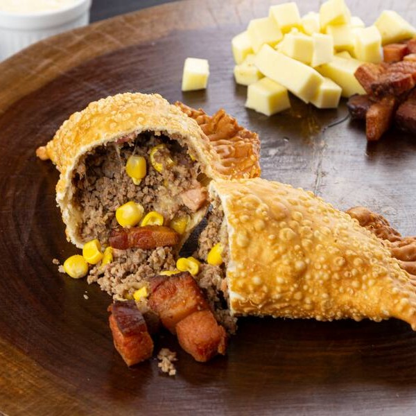 Bacon, milho, mussarela, tomate, cebola, carne moída, banana.